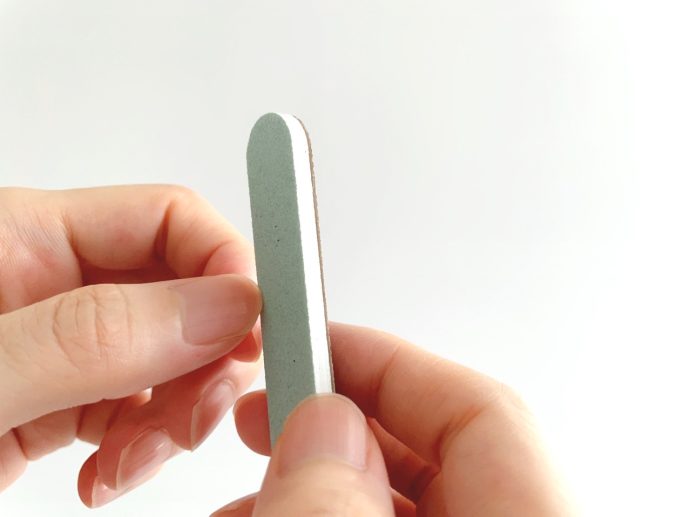 サンディングは、スポンジバッファーやエメリーボードの目が細かい面を使って、爪表面が曇る程度にかけるだけでOKです。削りすぎると爪が薄くなってしまうので気をつけてくださいね。