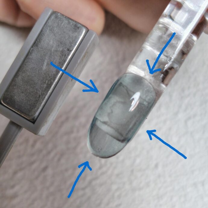 ベースジェルに凹凸があるとマグネットの光が歪むので、均一に塗るようにしましょう。