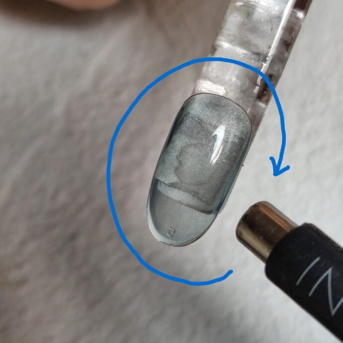 円柱タイプの磁石は、爪の周りを円を描くように動かすと、ラメが真ん中に集まります。